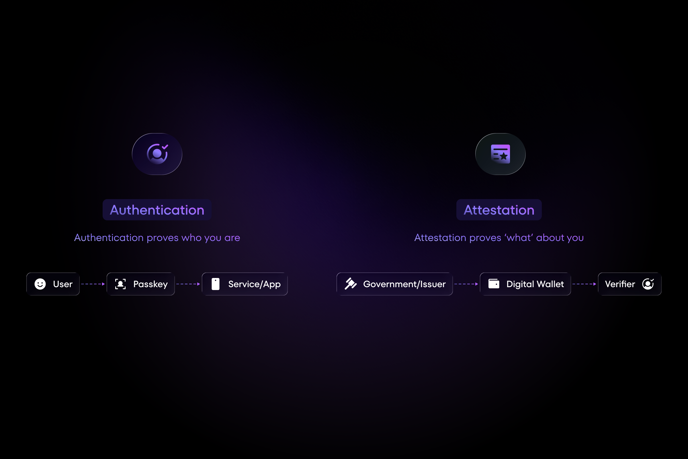Digital credentials are built for attestation. They answer the question: "What verified facts about you can you prove?"