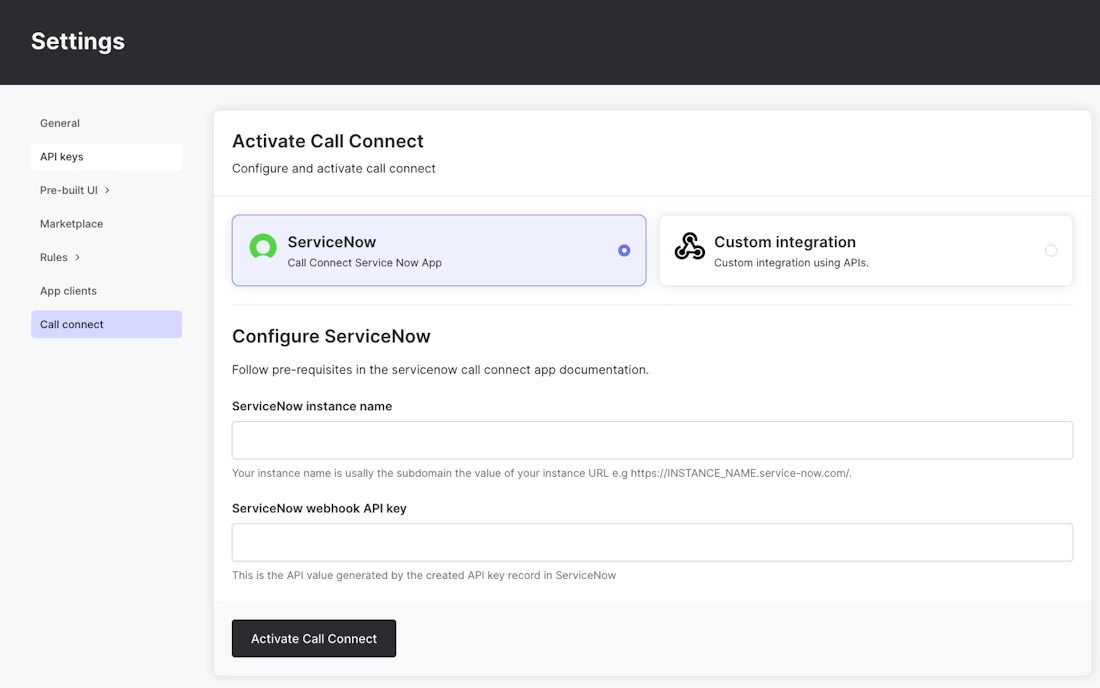 Log into your Authsignal portal and go to Settings > Call Connect. Select the ServiceNow integration option.