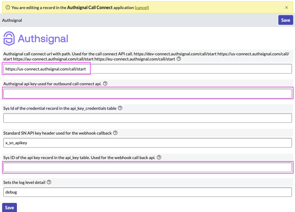 Navigate to the Call Connect API section in your Authsignal portal. Copy the API key and paste it into the "Authsignal API key" field in ServiceNow.