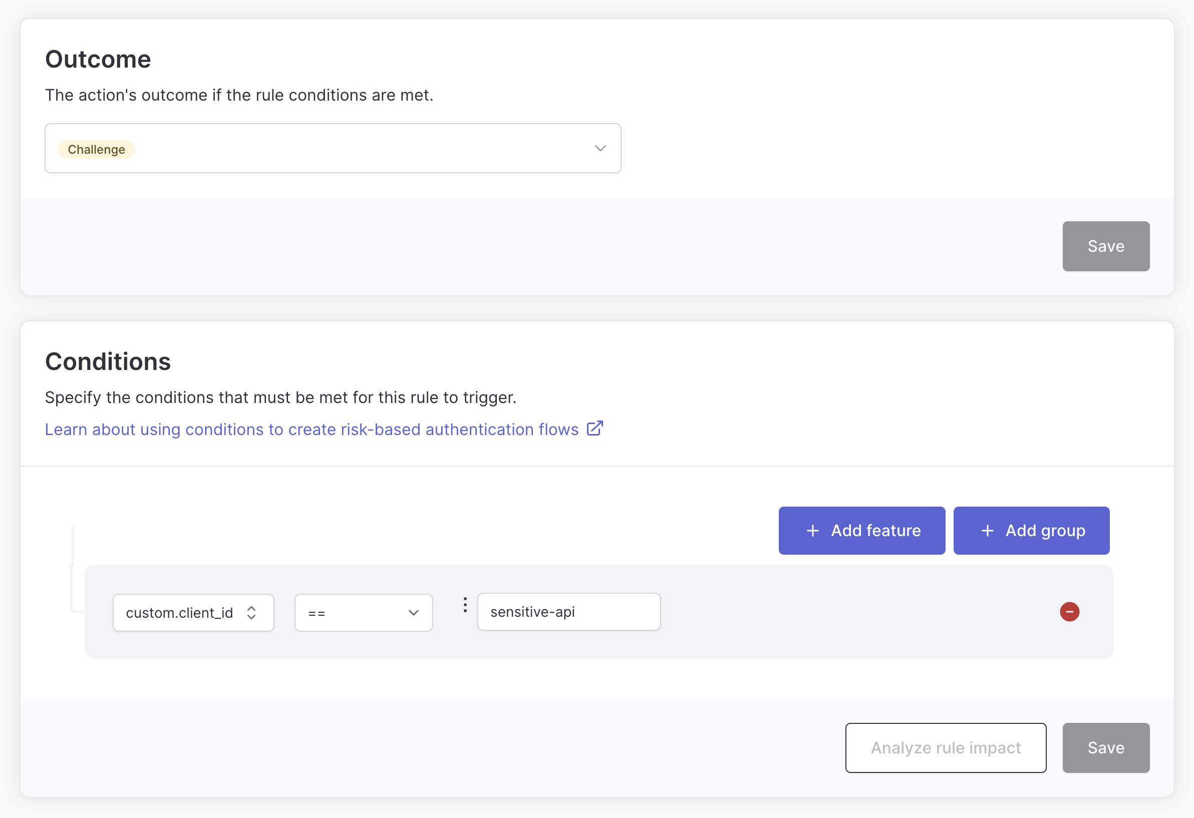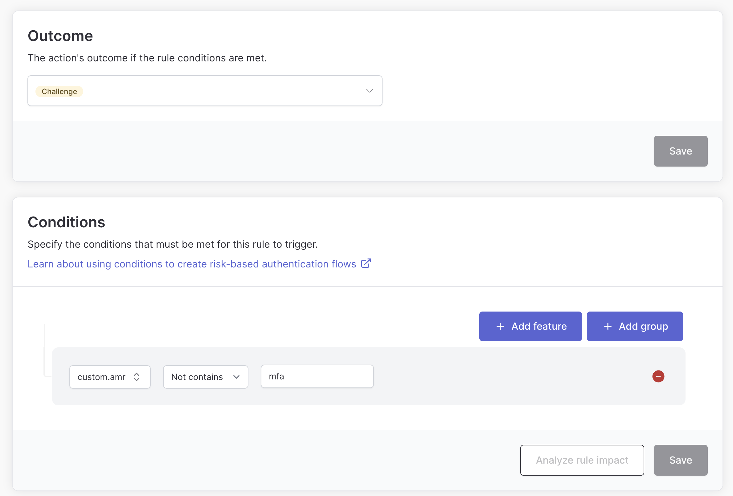 In our example we pass along the amr claim from the session cookie in the track call. This allows us to define rules based on the presence of this claim, ensuring that a user isn’t required to use MFA until they attempt to access a sensitive application.